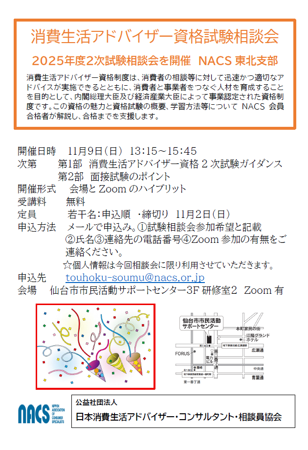 NACS東北支部では、「消費生活アドバイザー2次試験相談会」を開催いたします。