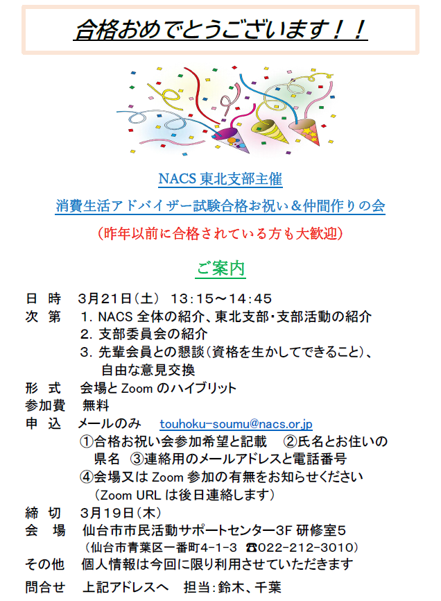NEWSNACS東北支部主催 消費生活アドバイザー試験「合格お祝い会&仲間作りの会」ご案内